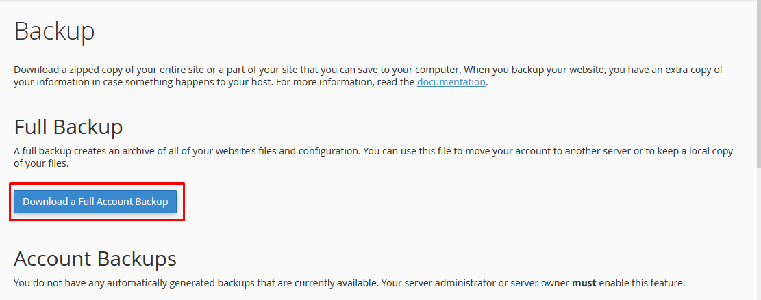 3. Under Full Backup, click Download a full backup of the account.