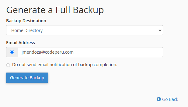 A full cPanel backup makes a copy of all your files, email, databases, etc. Once started, you must allow the backup to take place. The server can send you an email to an address you specify once the backup is ready to download. The steps for generating, downloading and restoring a full backup are explained in detail below.